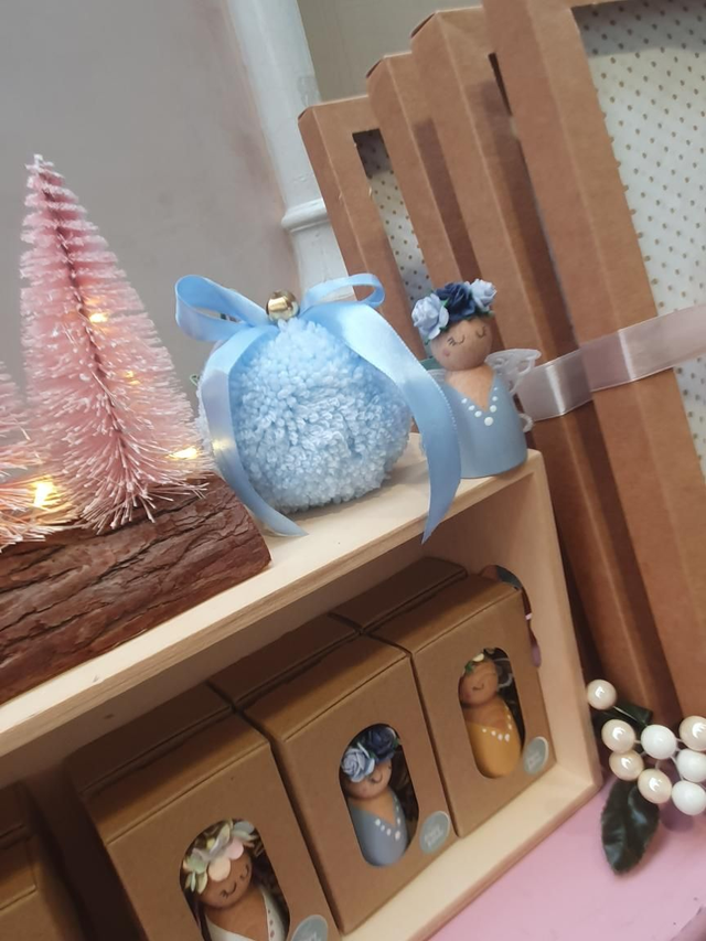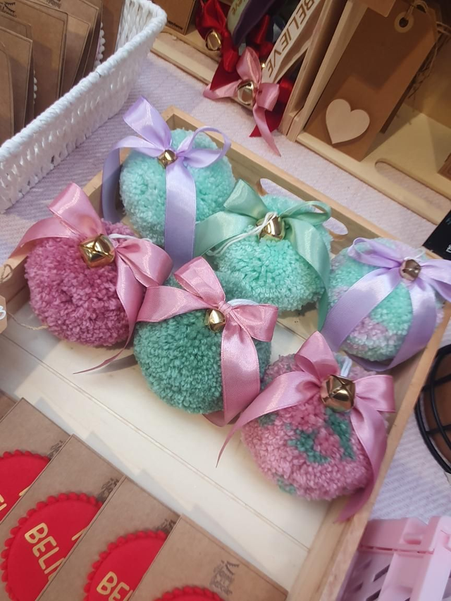 A large handmade pom pom bauble complete with a satin bow and bell.